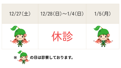 ☆年末年始 診療のご案内☆ 2025.12.11 新着情報 / その他 / お知らせ / 診療時間のご案内 本年の診療は12/27(土)11:30までとさせていただきます。 2026/1/5(月)より通常通りの診療となります。 年末年始の休診中にお薬が切れないよう、定期処方を受けている患者様は、残薬日数を確認し余裕をもってご来院ください。